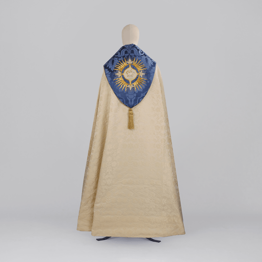 Minster Cope in Cream 'Holbein' with Blue 'Bellini' Orphreys and Sacred/Immaculate Heart Embroidered Hood -