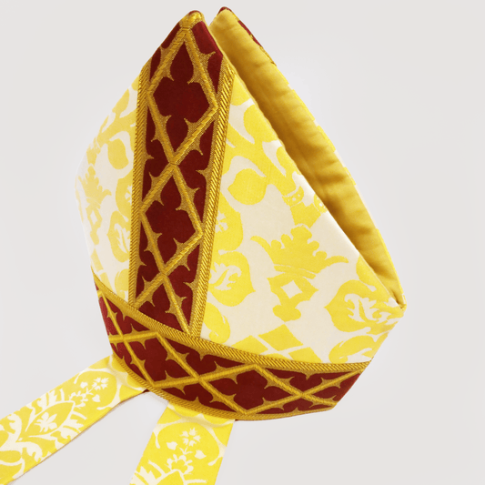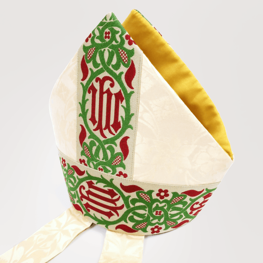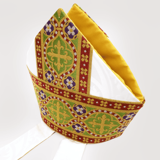 Prinknash Mitre in Oyster 'Shrewsbury' with Sarum Red/Gold 'Gothic' Orphreys