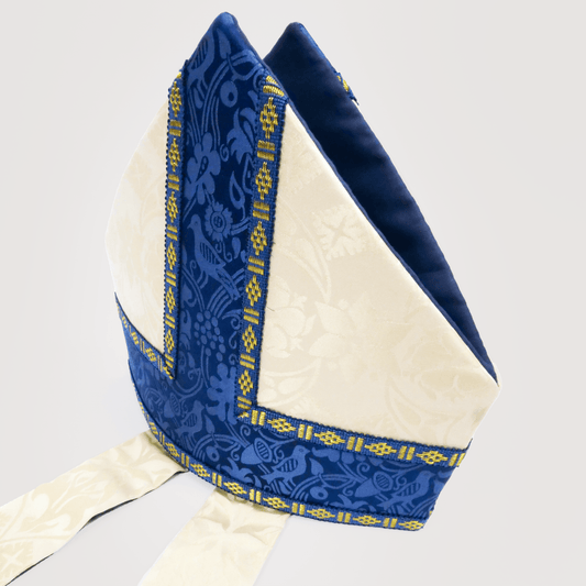 Experts in hand-sewn mitres, which can be designed in all heights, fabrics and sizes to suit your requirements, standard shape and bespoke. Exclusive silks, trimmings and orphreys are available, with coordinating lappets, as well as simple white mitres.