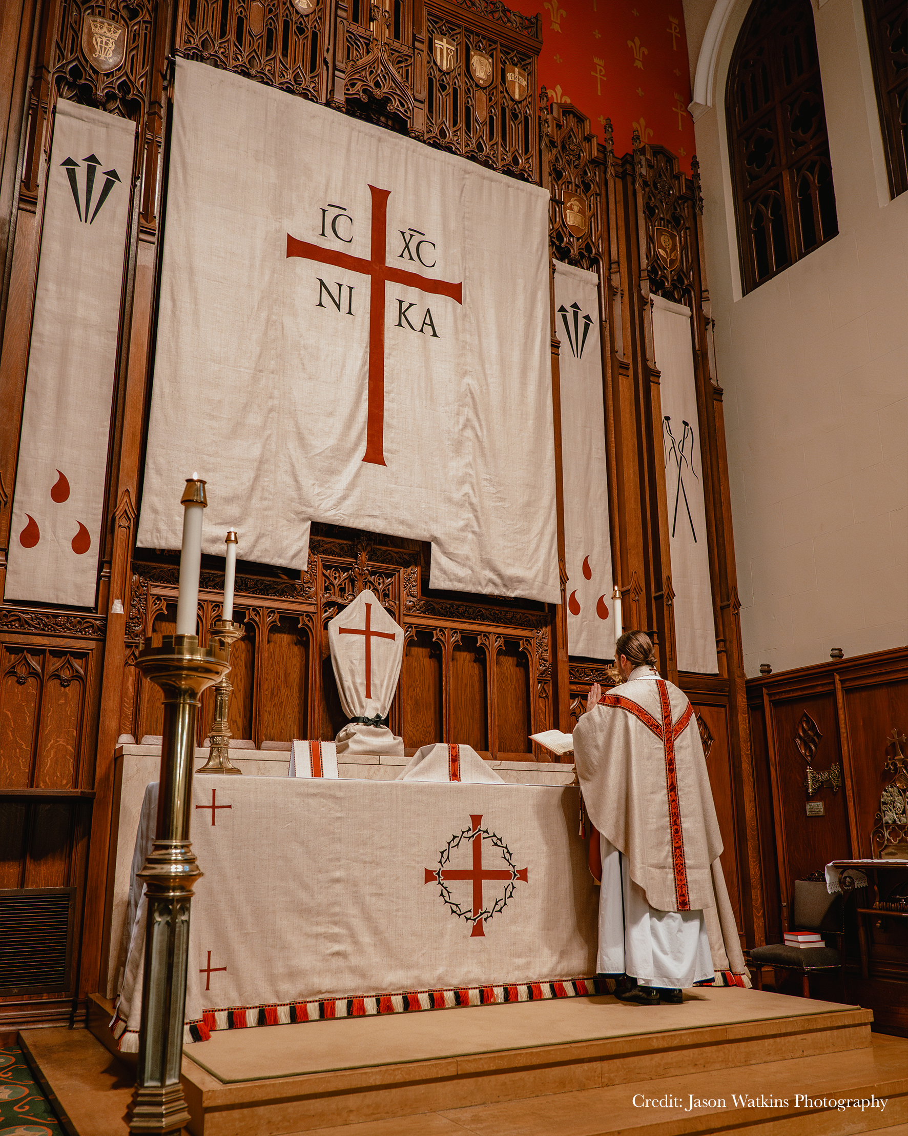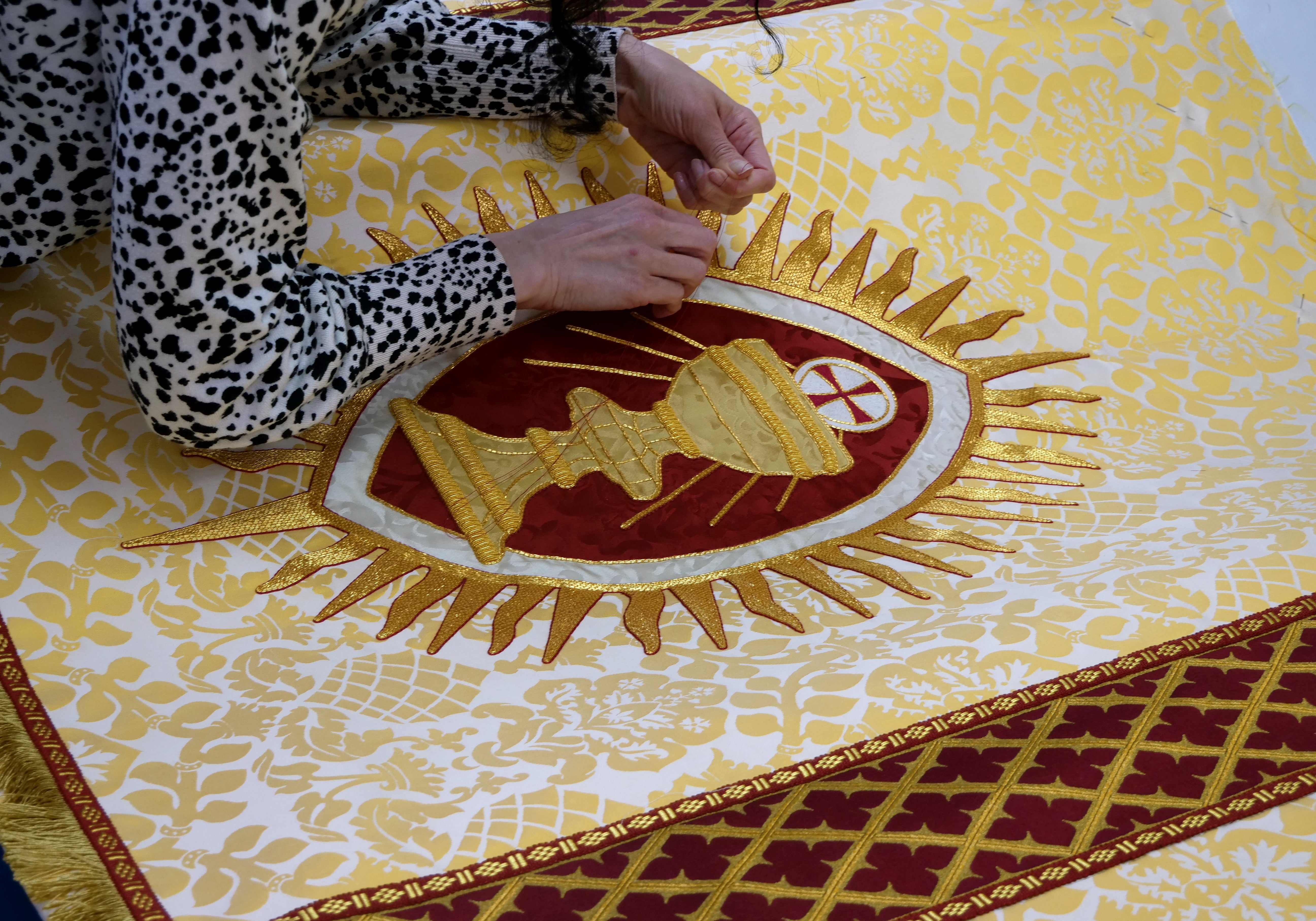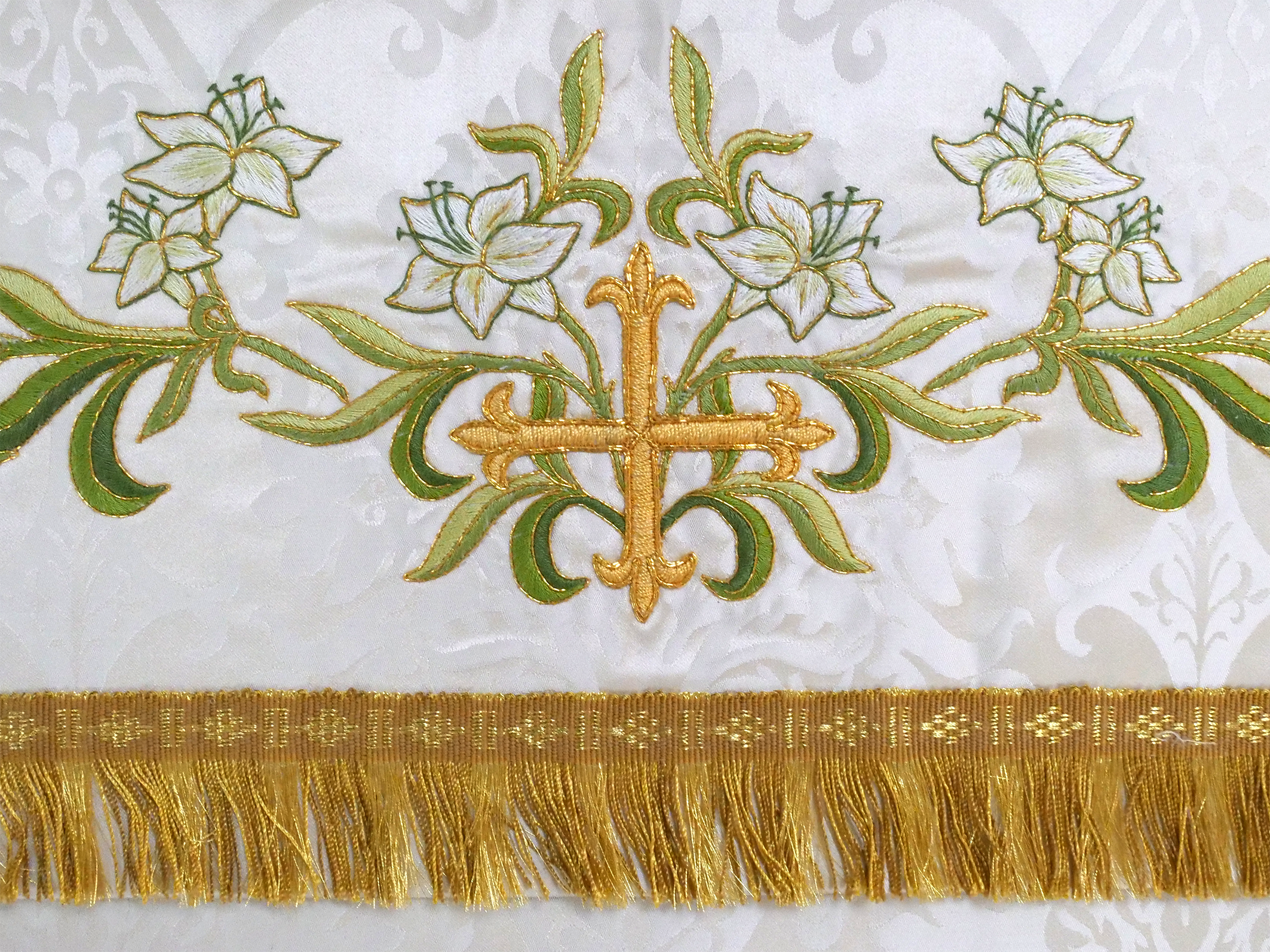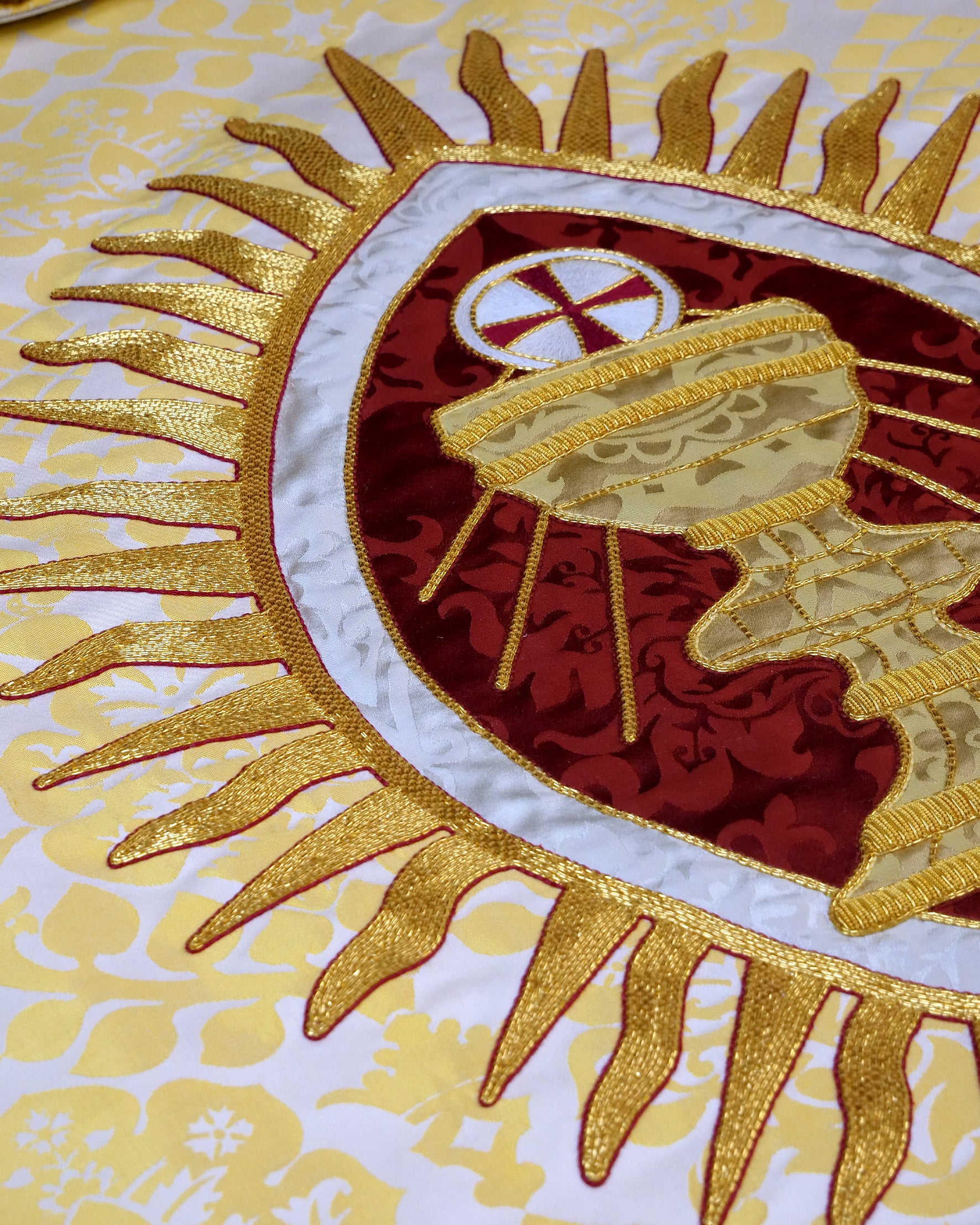 We were honoured to craft vestments for the 10th National Eucharistic Congress held in Indianapolis in 2024. To complement our White & Gold 'Davenport' vestments, a special frontal was hand-embroidered and handcrafted in our workroom.
