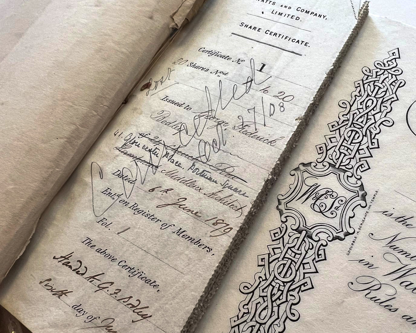 Watts & Co. share cetificate for G.F. Bodley, dated 1879.