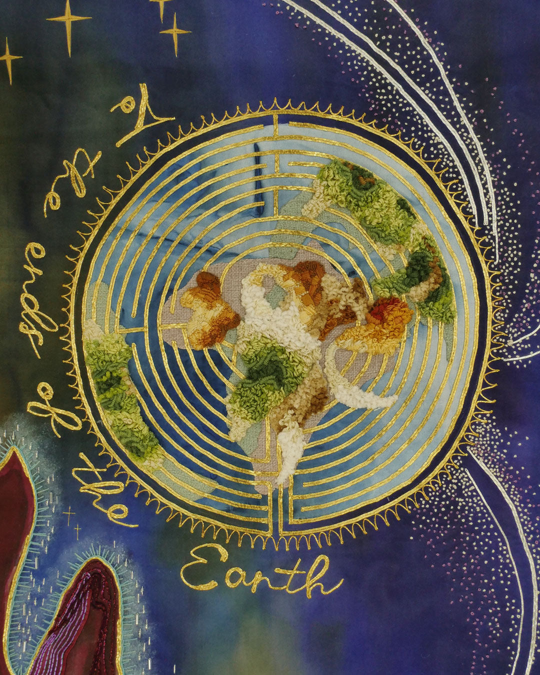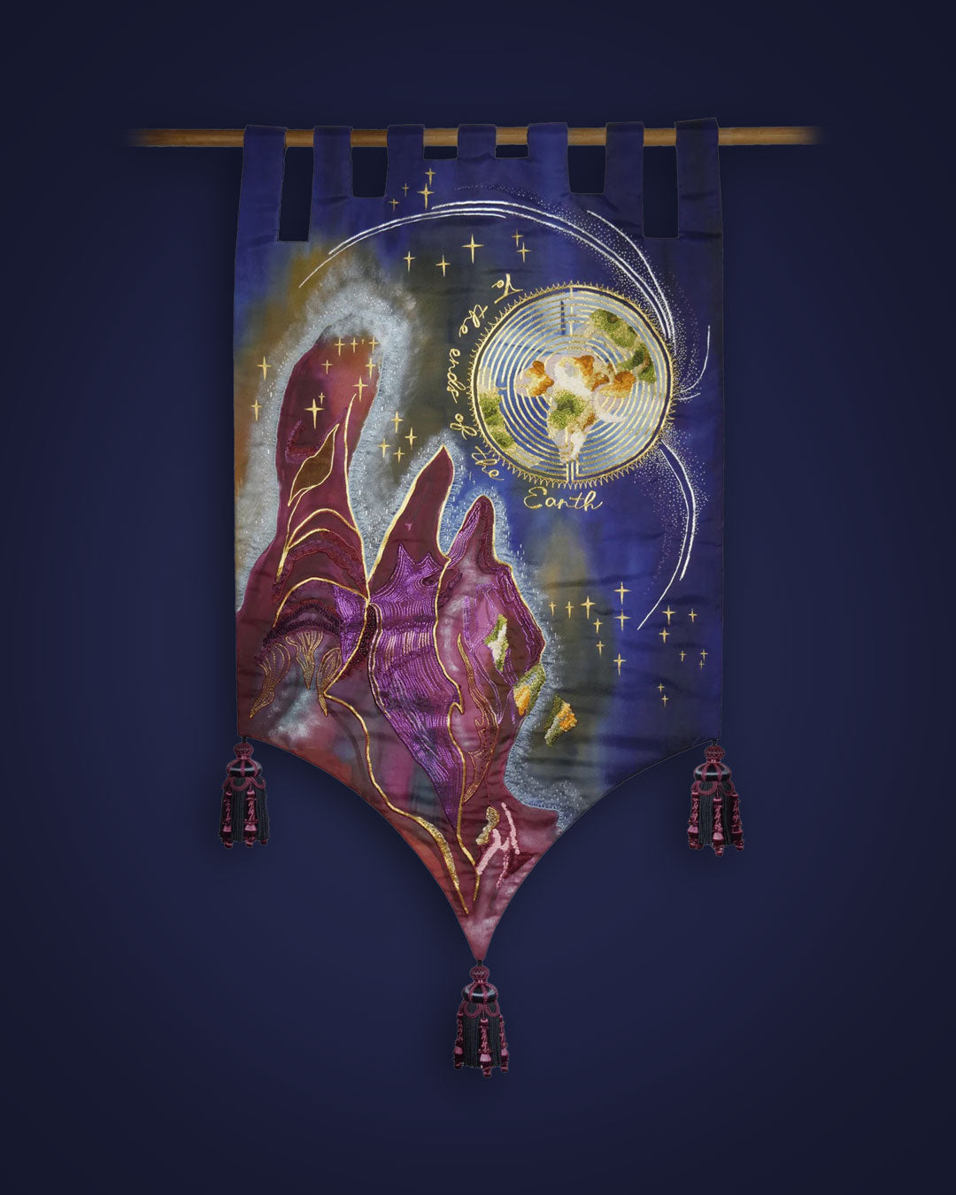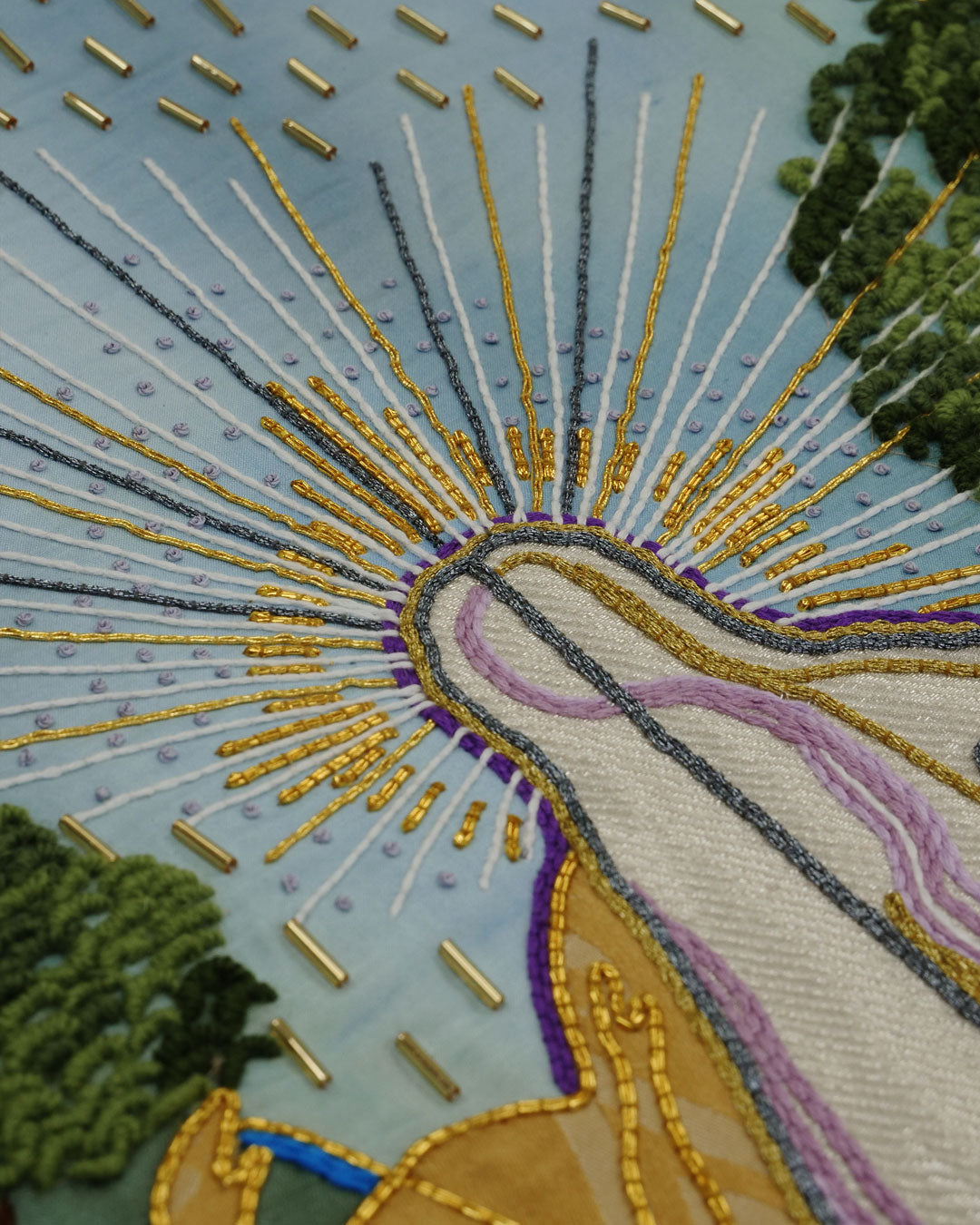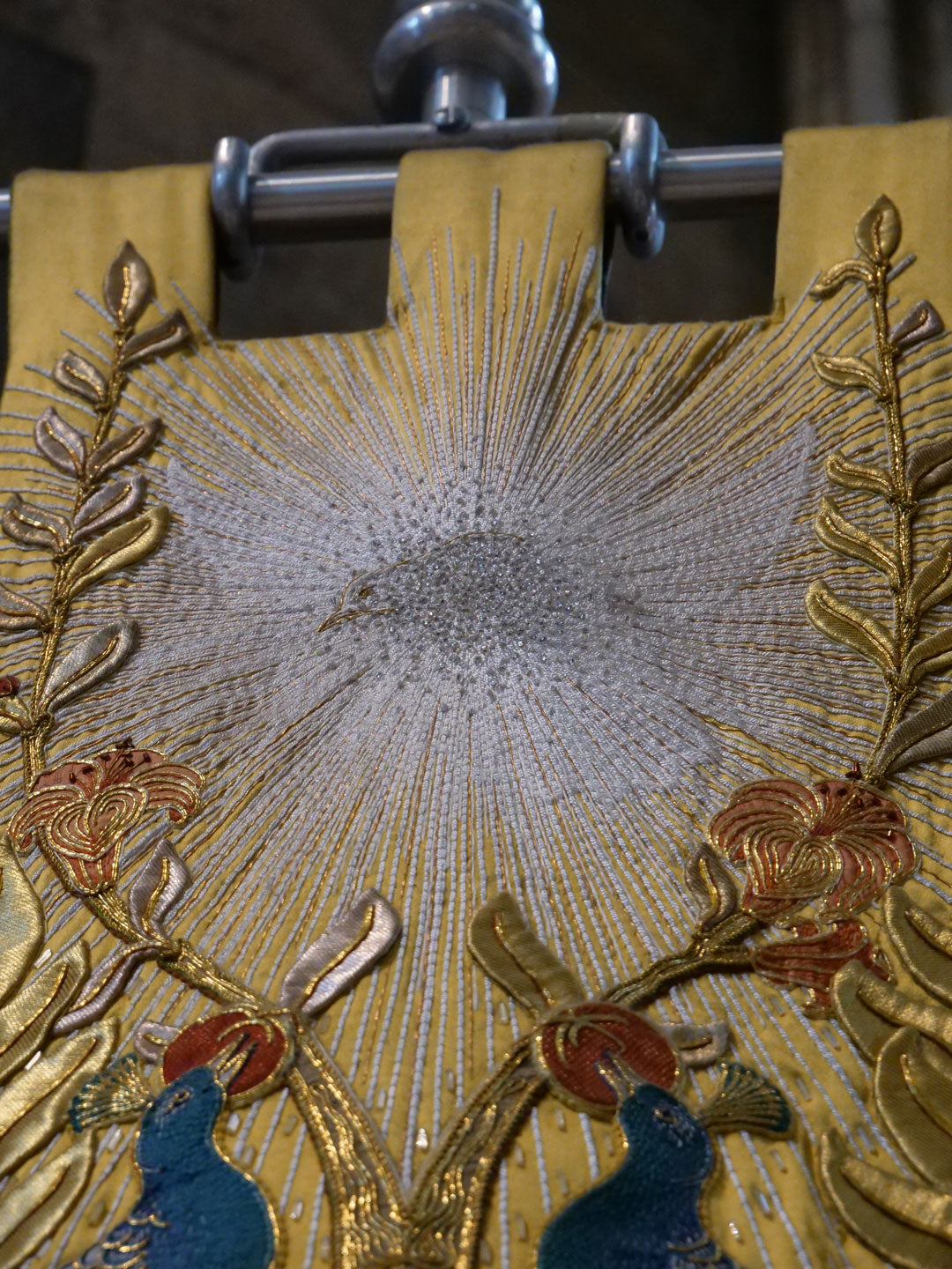 For the Crucifixion Banner we worked entirely in hand embroidery. The banner is an extraordinary acclamation of God incarnate and God unconfined in harmony. Delicately executed in Or Nue with Japanese Gold thread, the branches reach into the light of the heavenly state, transforming with God’s unconfined transcendence.