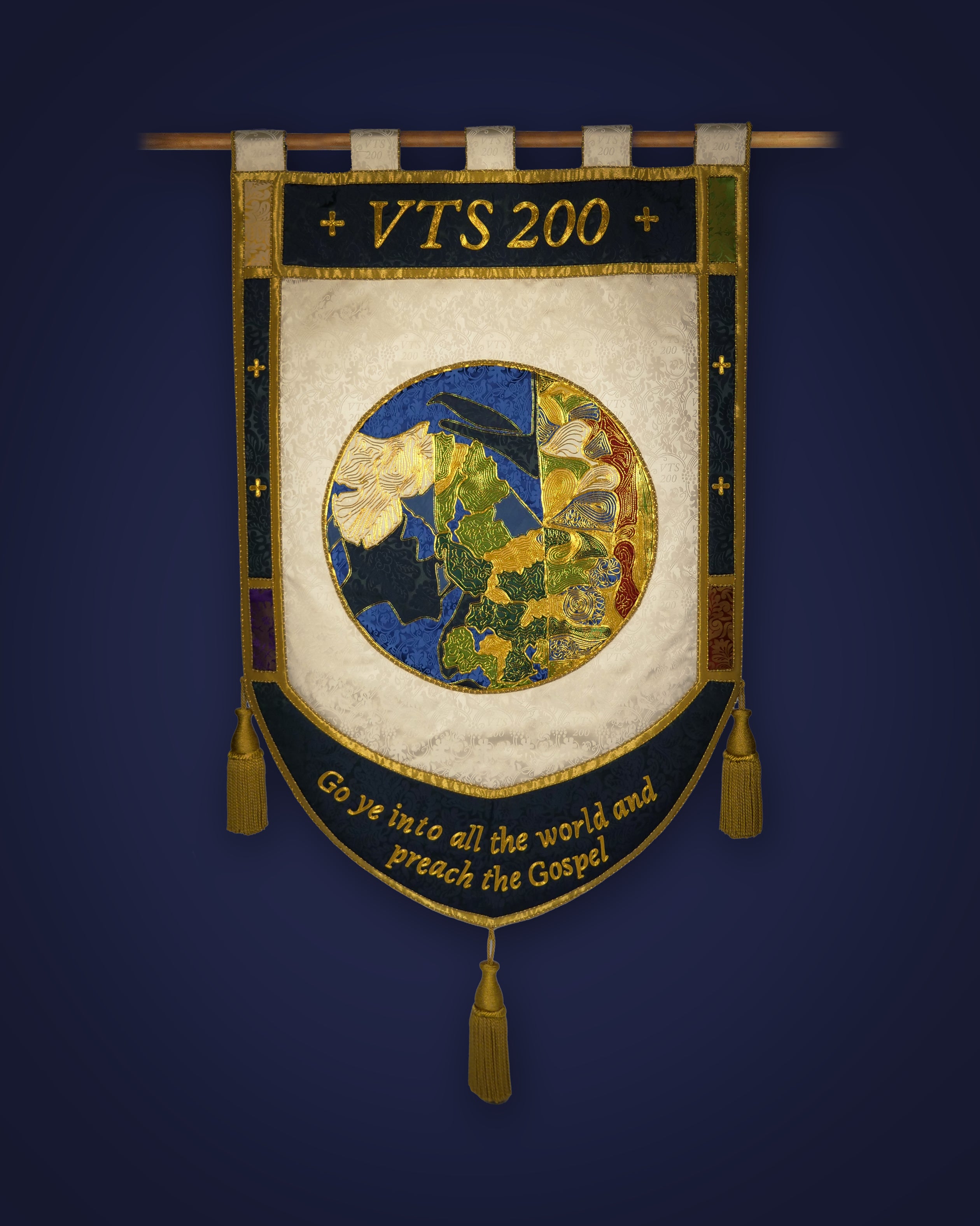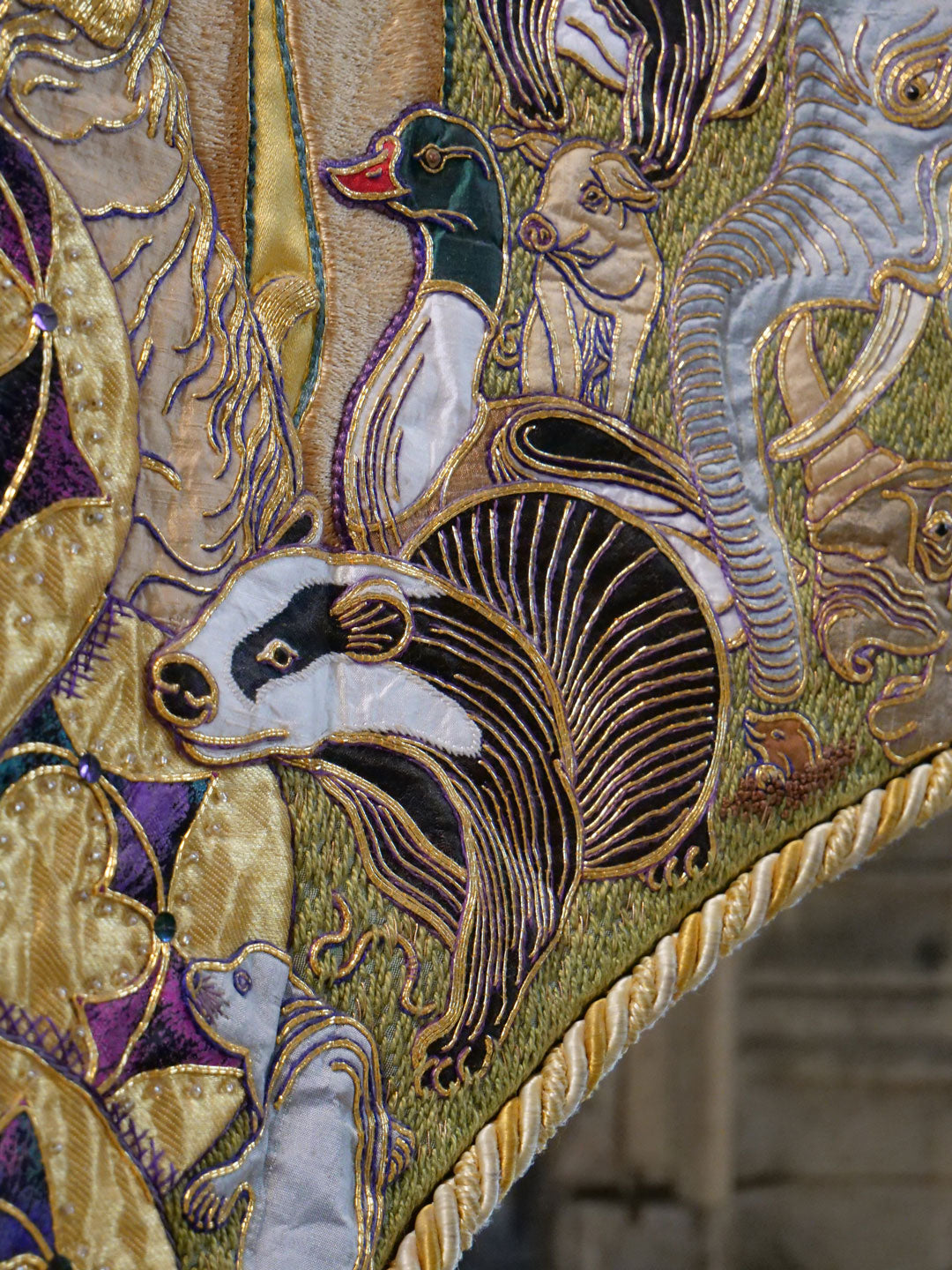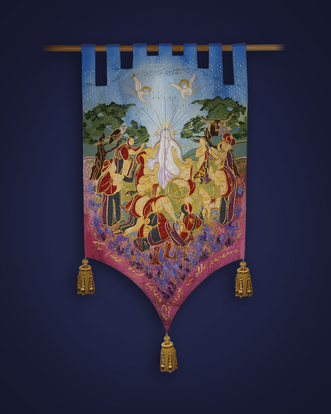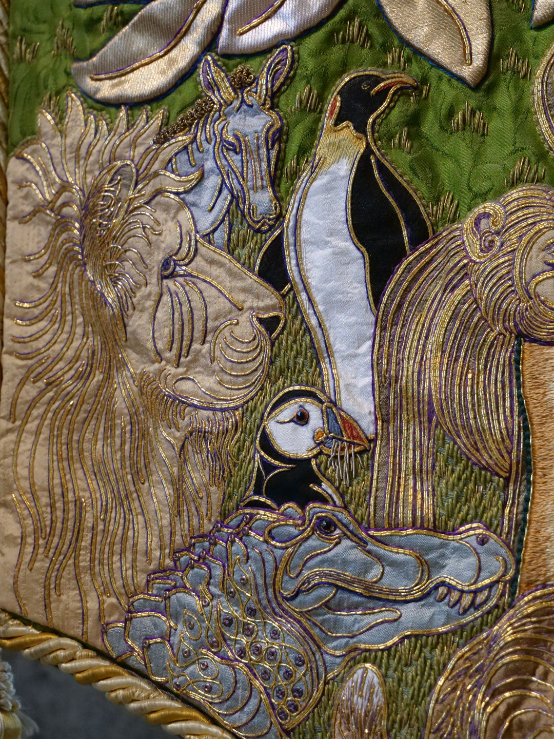 The Garden of Eden Banner is a delightful menagerie of hand-embroidered animals encircle Adam & Eve beneath the light of the Holy Spirit. Japanese gold thread, silk appliqué, and delicate silk shading evoke life in all its forms at the beginning of creation.