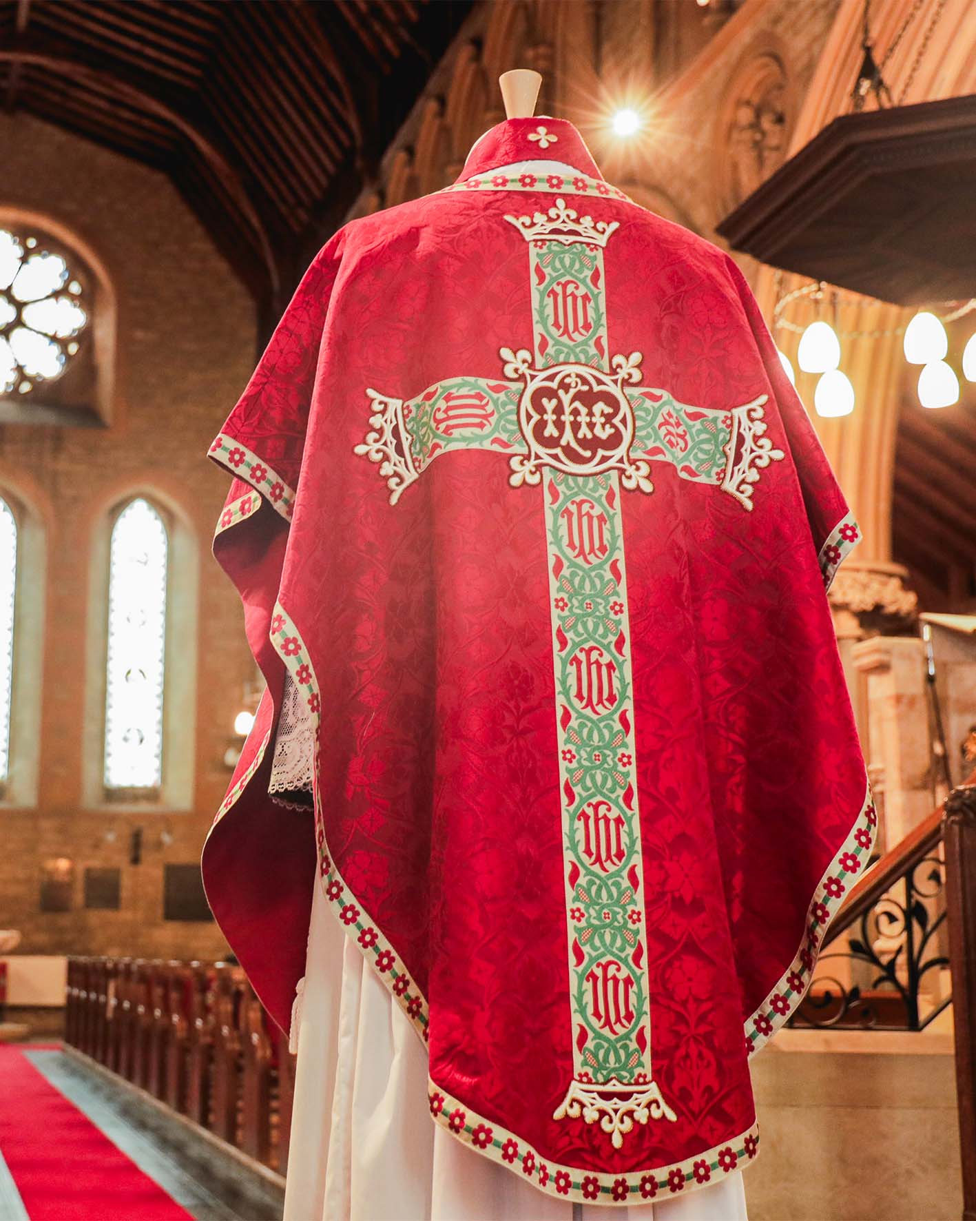 Our Holy Name range of vestments reflects the international nature and appeal of Augustus Pugin’s work: the orphrey and embroidery are of English origin, whereas the main St. John's fabric pattern was designed by Pugin for a vestment set for a church in Australia. It was our second vestment set inspired by and based on the work of A.W.N. Pugin. This set is made in England, and its beautiful damask fabric maintains Watts’ proud tradition of producing the finest quality vestments.