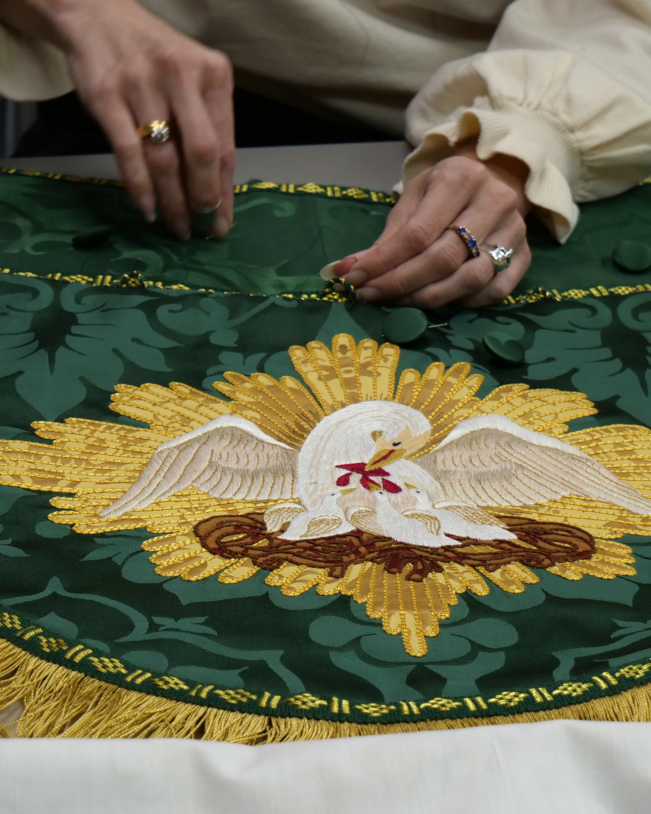 A Minster style cope in Oyster 'Shrewsbury' with orphreys, hood, and morse in Green 'Bellini' silk. It features a detachable hood showing a hand-embroidered pelican surrounded by Gold 'Gothic' appliqué fabric. It is lined in gold cotton sateen and includes a matching stole.